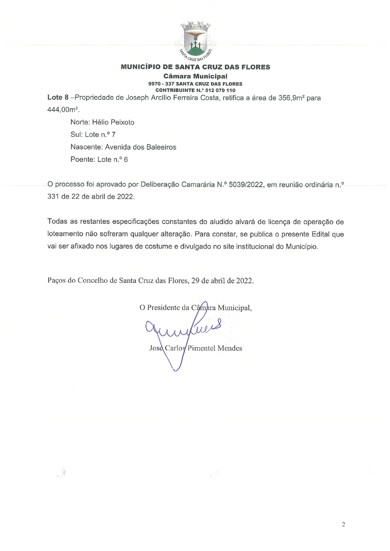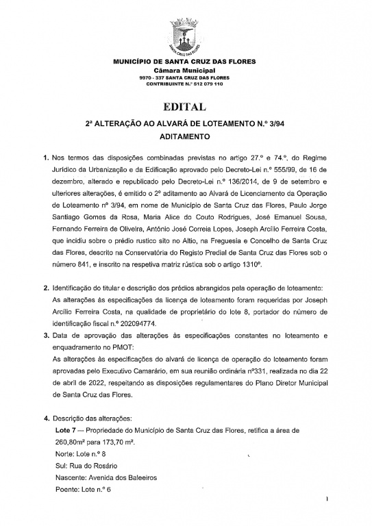 Edital - 2.ª Alteração ao Alvará de Loteamento n.º 3/94 - Aditamento