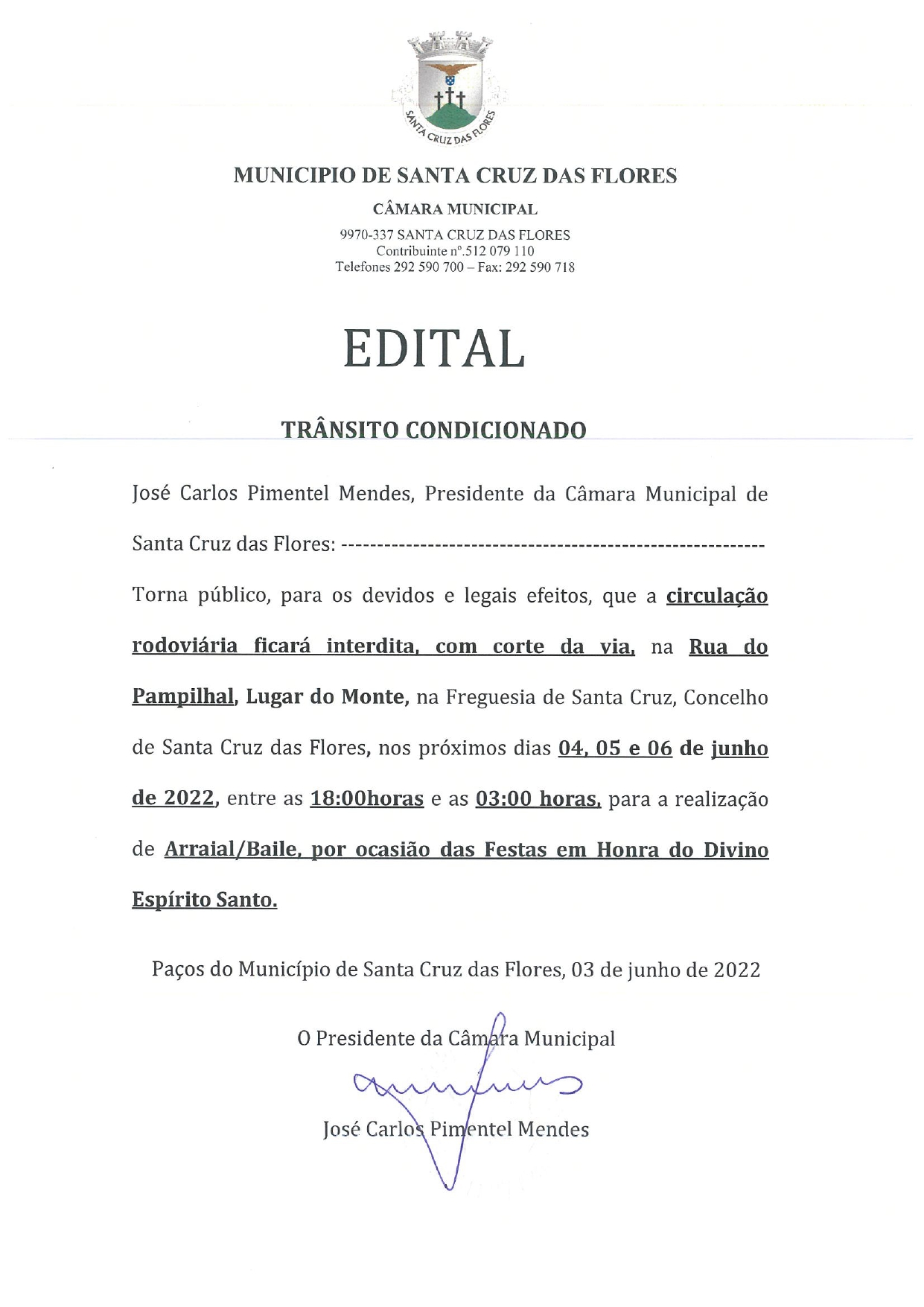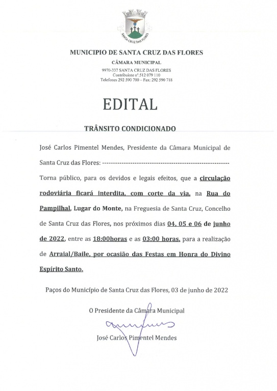 Aviso - Trânsito Condicionado - Rua do Pampilhal - Festa do Divino Espírito Santo do Monte