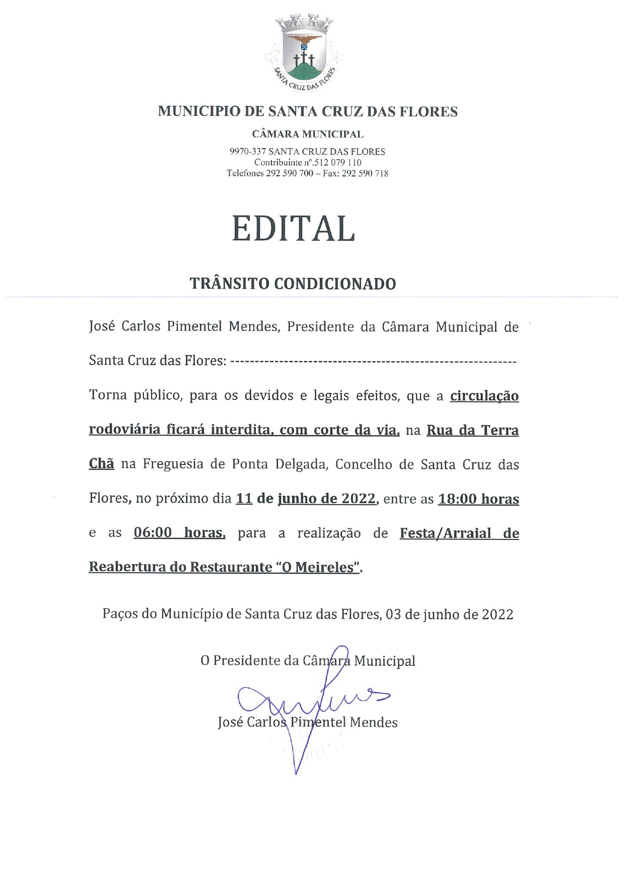 Aviso - Trânsito Condicionado - Rua da Terra Chã