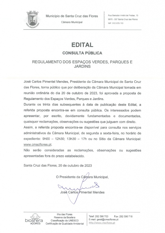 Edital - Consulta Pública Regulamento dos Espaços Verdes, Parques e Jardins