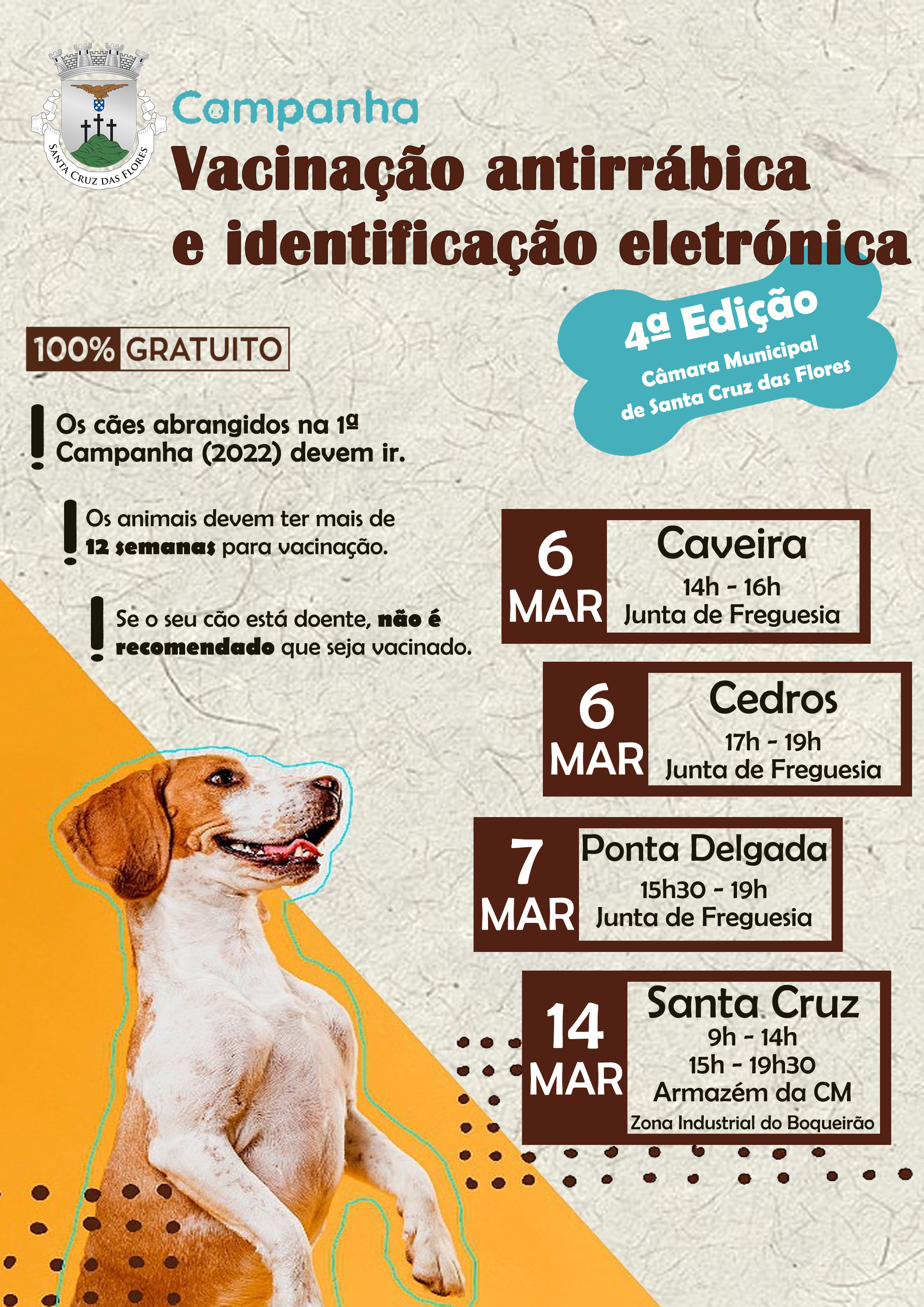 A Câmara Municipal de Santa Cruz das Flores irá organizar nos próximos dias 6, 7 e 14 de março a 4ª Edição da Campanha de Vacinação Antirrábica e Identificação Eletrónica de canídeos por todo o Concelho.