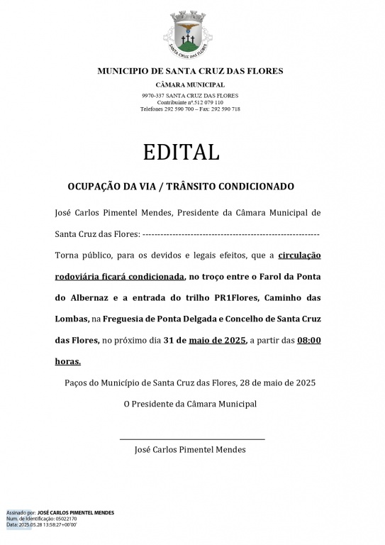 Edital - Ocupação da Via / Trânsito condicionado dia 31 de maio