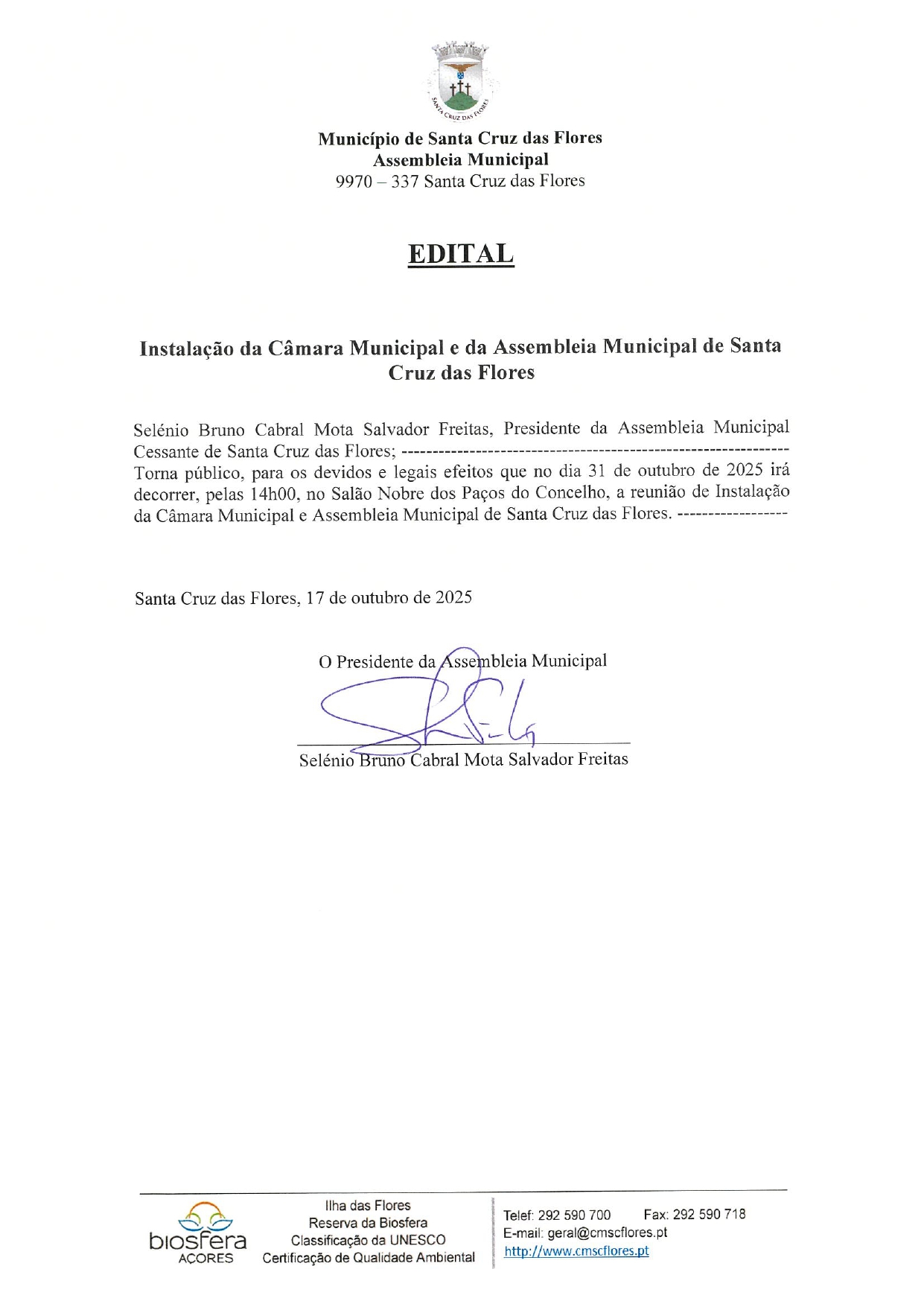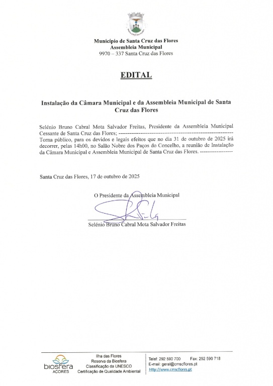 Edital - Instalação da Câmara Municipal e da Assembleia Municipal de Santa Cruz das Flores