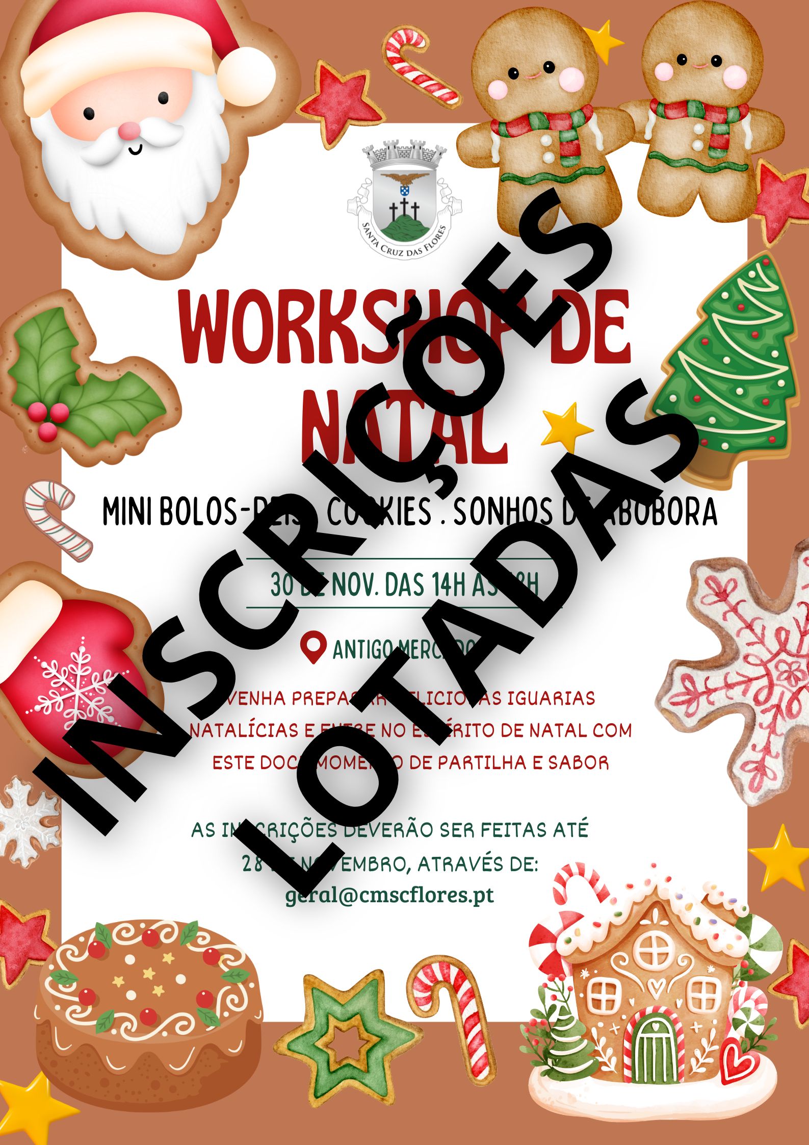 A Câmara Municipal de Santa Cruz informa que o 1.º Workshop de Natal está completamente lotado. As vagas foram preenchidas muito rapidamente e agradecemos imensamente o interesse de todos!