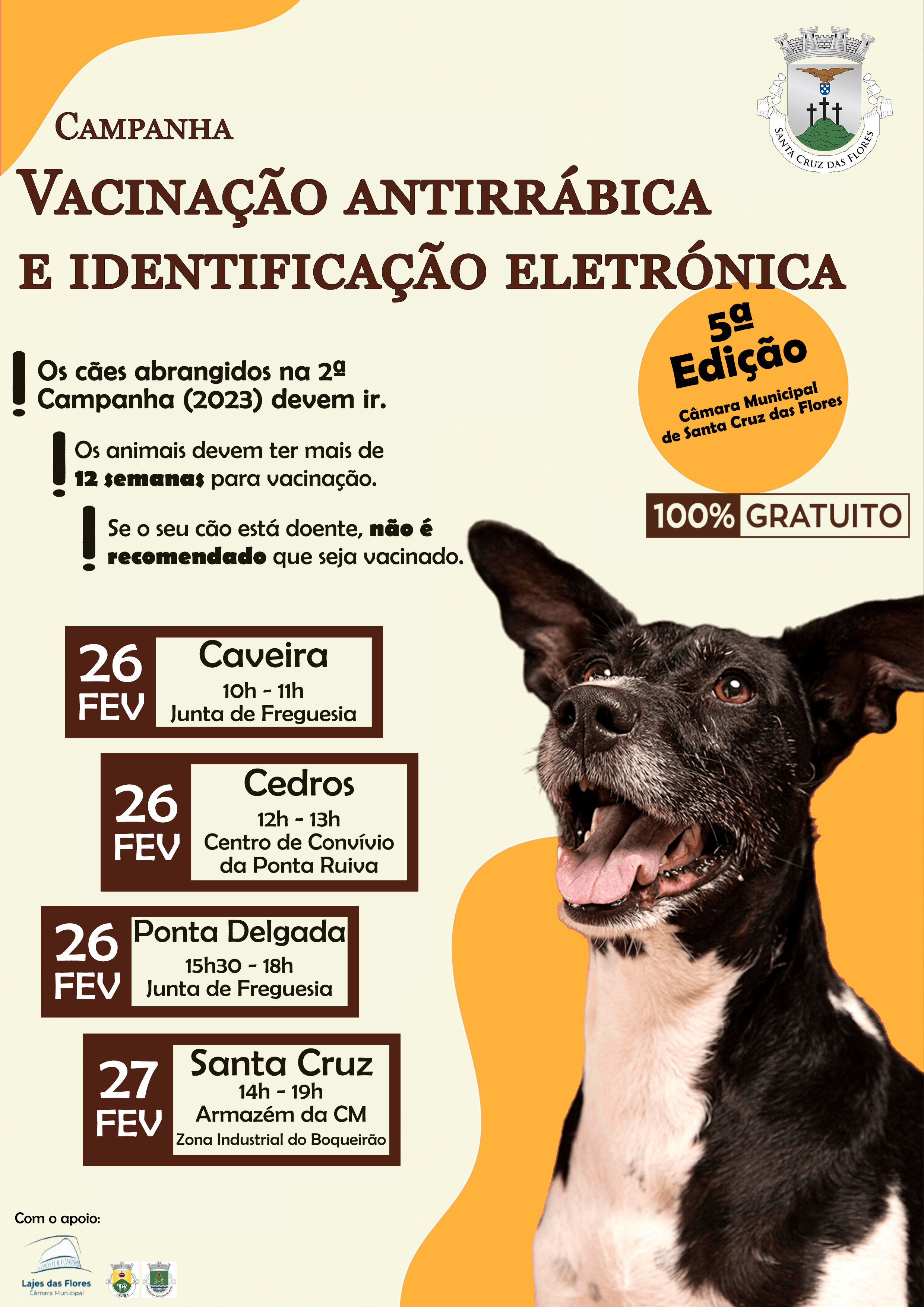 Decorreu nos dias 26 e 27 de fevereiro do presente ano a 5ª Edição da Campanha de Vacinação e Identificação Eletrónica de Canídeos, organizada pela Câmara Municipal de Santa Cruz das Flores. Esta campanha passou por todas as freguesias do Município, dando a oportunidade dos munícipes se deslocarem ao local que lhes fosse mais conveniente.