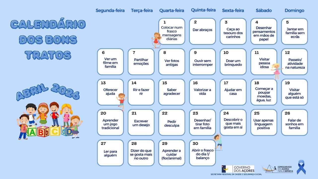 Partilhamos também um calendário de bons tratos, dirigido a pais e filhos, com pequenas ações diárias que