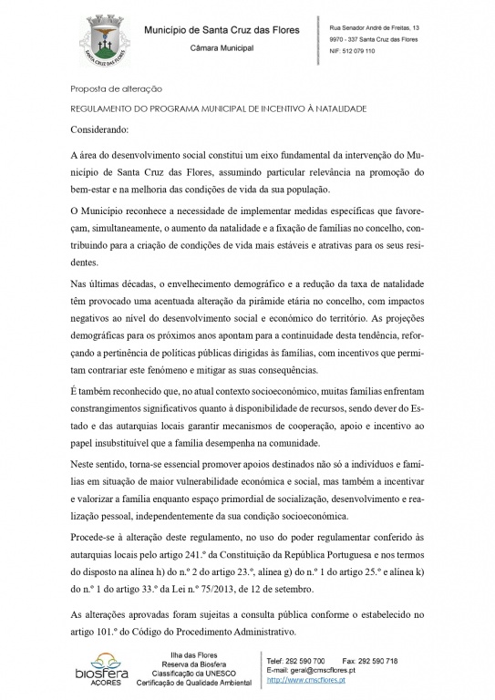 Proposta de Alteração do Regulamento do Programa Municipal de Incentivo à Natalidade
