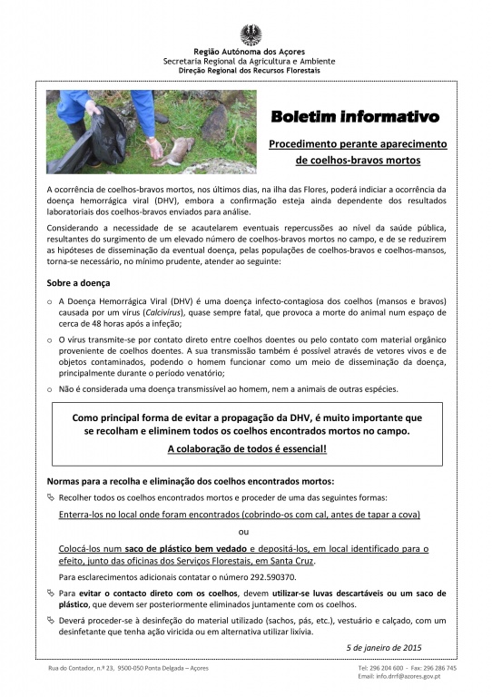Informa-se a população da ilha das Flores para a possível ocorrência de focos de DHV (Doença Hemorrágica Viral) no coelho bravo e doméstico.