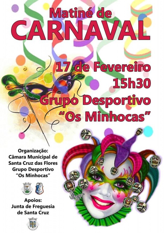 A Câmara Municipal de Santa Cruz das Flores em conjunto com o Grupos Desportivo "Os Minhocas", irá organizar no dia 17 de fevereiro pelas 15:30 no salão dos Minhocas, uma Matiné para as crianças. Não fique em casa! Fantasie o seu filho e venham brincar ao Carnaval!!!